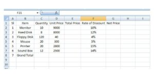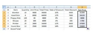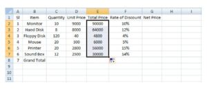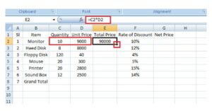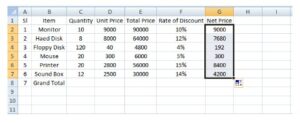 ধরুন কম্পিউটারের বিভিন্ন যন্ত্রাংশের একটি বিক্রয় বিবরণী আমরা তৈরি করবো। যেমন ধরুনঃ মনিটর, হার্ড ডিস্ক, ফ্লপি ডিস্ক, মাউস, প্রিন্টার, সাউন্ড বক্স ইত্যাদি। এ সকল যন্ত্রাংশের বিভিন্ন পরিমান ও বিভিন্ন ডিস্কাউন্ট সমন্বয় করার জন্য যে সকল ফর্মুলা ব্যবহার করতে হয় তা নিচে ছবিতে দেখানো হলঃ