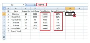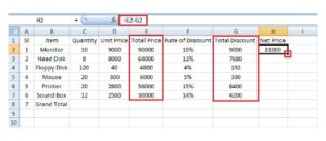 এবার আমরা নীট প্রাইস বের করবো, এ জন্য টোটাল প্রাইস থেকে টোটাল ডিস্কাউন্ট বাদ দিতে হবে অর্থাৎ বিয়োগ করতে হবে। সে ক্ষেত্রে টোটাল প্রাইস এর প্রথম সেলটি সিলেক্ট করুন, এরপর ফর্মুলা বারে লিখুন =E2-G2 এবার ইন্টার চাপুন, তাহলে নীট প্রাইস বের হয়ে আসবে।