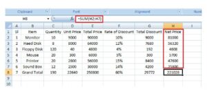 উপরের ছবিতে প্রতিটি বিষয়ের আলাদা আলাদা গ্র্যান্ড টোটাল বের করা হয়েছে। শুধু নীট প্রাইস এর গ্র্যান্ড টোটাল বের করার জন্য ফর্মুলা বারে SUM এর ফর্মুলাটি দেখানো হয়েছে। একই ভাবে সবগুলো বিষয়ের জন্য আলাদা ভাবে =SUM ব্যবহার করে গ্র্যান্ড টোটাল বের কতে পারবেন।