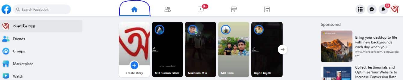 আপনার ফেসবুক একাউন্ট লগইন হওয়ার পরে, ফেসবুক এর হোম পেজ দেখতে পারবেন। নিচের ছবি দেখুনঃ