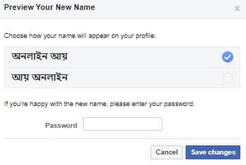 উক্ত পাসওয়ার্ড দেওয়ার পরে, নিচে দেওয়া Save Changes অপশনে ক্লিক করবেন। সাথে সাথে আপনার ফেসবুক নতুন নাম যোগ হয়ে যাবে। নিচের ছবিটি দেখুন।