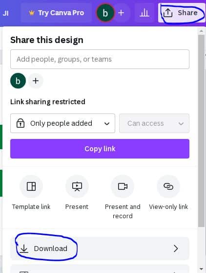 ক্যানভাতে যে কোন লোগো ডিজাইন করার পরে, আপনি সহজেই হাই কোয়ালিটি ডাউনলোড করতে পারবেন। লোগো তৈরির পরে ডাউনলোড করার জন্য আপনাকে ক্যানভার ড্যাশবোর্ডের ডান পাশে Share নামে অপশন পেয়ে যাবেন।