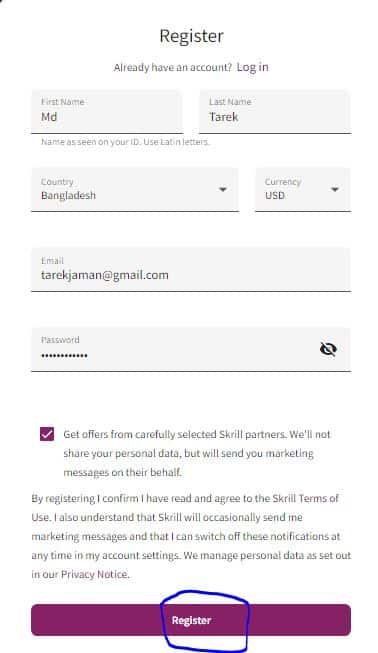 উপরের ছবির মতো Register অপশনে ক্লিক করার পরে আপনাকে আরো একটি পেজ দেওয়া হবে। আর সেই পেজের মাধ্যমে আপনাকে স্ক্রিল একাউন্ট খোলার জন্য কিছু তথ্য প্রদান করতে হবে। যেমন-
