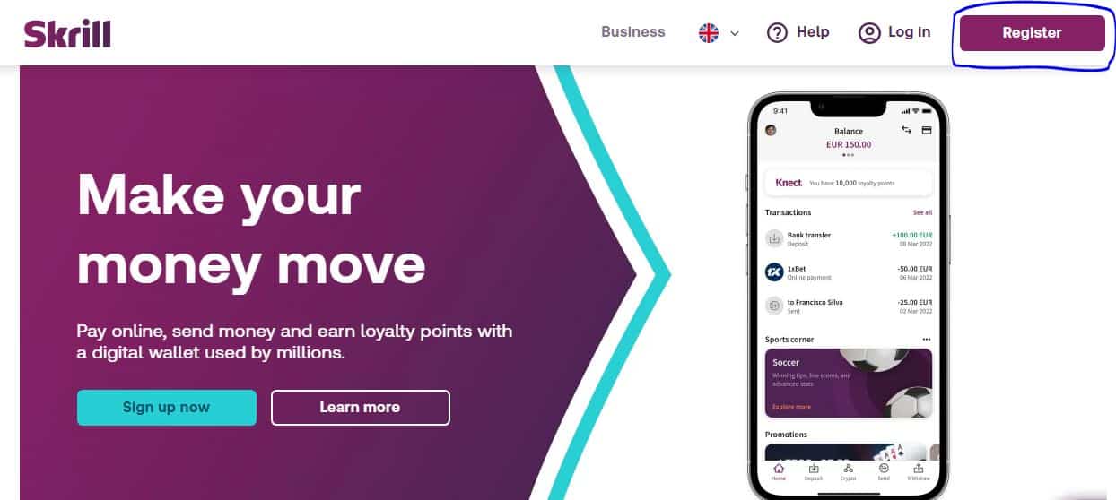 তার জন্য আপনাকে প্রথমে স্ক্রিল এর অফিসিয়াল ওয়েবসাইট যেমন- www.skrill.com প্রবেশ করুন। তারপরে পেজ ওপেন হওয়ার পরে সবার উপরের ডান পাশের অংশে দেখতে পারবেন Register নামে একটি অপশন সেখানে ক্লিক করবেন। নিচে দেওয়া ছবিটি দেখুন।