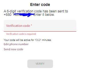 উক্ত কাজ শেষ করার পরে, আপনাকে আরো একটি পেজ দেওয়া হবে। সেখানে আপনার যে মোবাইল নম্বরটি প্রদান করেছেন। সেখানে একটি 6 ডিজিট এর কোড যাবে। সেটি নির্দিষ্ট অংশ যুক্ত করে ভেরিভাই অপশনে ক্লিক করবেন। নিচের ছবিটি দেখুন।