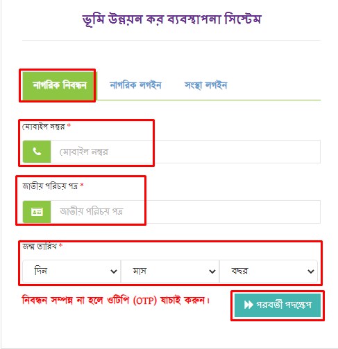 ছবিসহ ভোটার আইডি কার্ড চেক করতে প্রথমে, ldtax.gov.bd লিঙ্কে প্রবেশ করতে হবে তারপর ভূমি উন্নয়ন কর ব্যবস্থাপনার নাগরিক নিবন্ধন পেজ এ নিয়ে যাওয়া হবে।