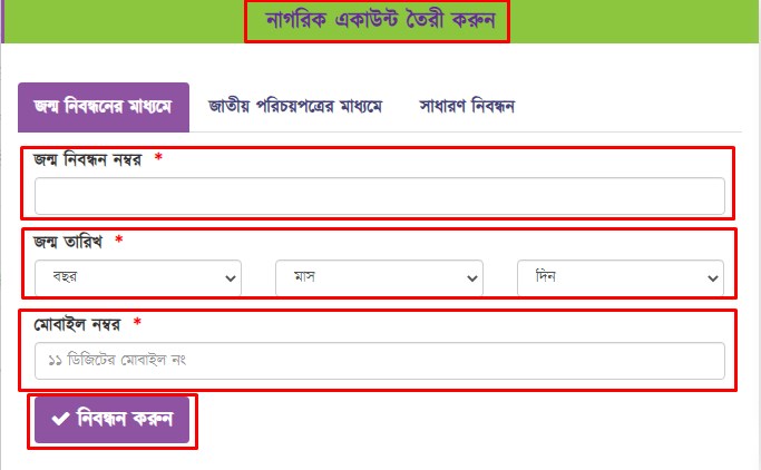 তবে, সরাসরি নাগরিক একাউন্ট পেজে নিয়ে যাবে। উক্ত ফরমটি পূরণ করার জন্য 10 ডিজিট বা 17 ডিজিট জাতীয় পরিচয় পত্র নম্বর, জন্ম তারিখ, এবং মোবাইল নাম্বার প্রয়োজন হবে। ফরমটি সঠিকভাবে পূরণ করে নিবন্ধন করুন বাটনে ক্লিক করে দিবেন। নিচের ছবি দেখুন-
