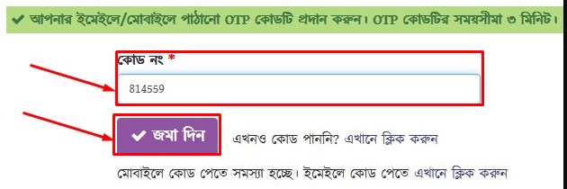 তারপর আপনার সামনে 6 ডিজিটের একটি ভেরিফিকেশন কোড চলে আসবে। কোডটি প্রবেশ করিয়ে জমা দিন বাটন এ ক্লিক করবেন তাহলে স্টেশন হয়ে যাবে এবং মোবাইলে পাসওয়ার্ড চলে আসবে নিচের ছবিটি দেখুন।