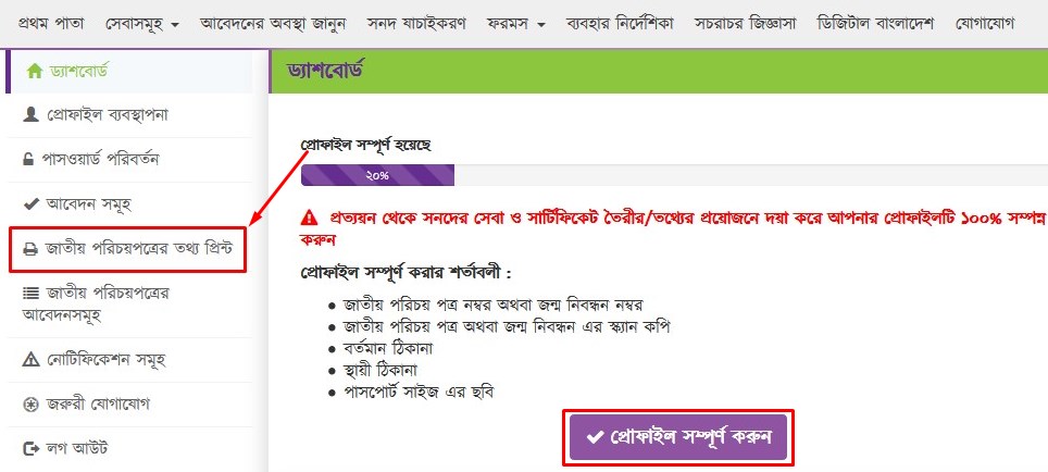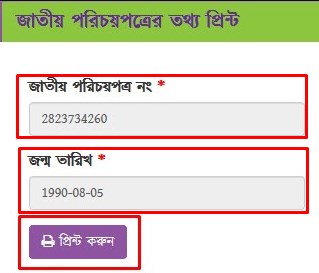 উপরিউক্ত ছবিতে, লাল চিহ্ন দ্বারা অংশে ক্লিক করতে হবে। তারপর পেজটি লোড হয়ে জাতীয় পরিচয় পত্রের তথ্য প্রিন্টের অপশন এ নিয়ে যাবে।