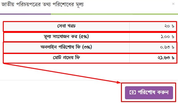 উপরের ছবির মত প্রিন্ট করুন বাটনে ক্লিক করার সঙ্গে সঙ্গে পুরাতন ভোটারদের, জাতীয় পরিচয়পত্র অনলাইন কপি ডাউনলোড করার জন্য নির্ধারিত যে খরচ গুলো দেখাবে। সর্বমোট 21 টাকা 36 পয়সা দিতে হবে। নিচের ছবিটি দেখুন-