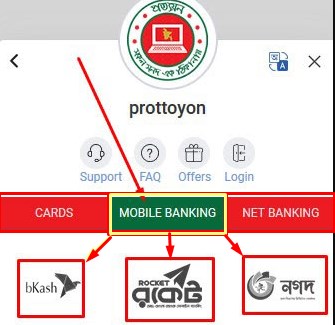 উপরে দেওয়া ছবির মতো, পরিশোধ করুন বাটনে ক্লিক করে দিতে হবে পেজ লোড হয়েছে। পরিষদের অপশন চলে আসবে। এখানে ডেবিট কার্ড, মোবাইল ব্যাংকিং এর মাধ্যমে ফি পরিশোধ করা যাবে। নিচের ছবিটি দেখুন-