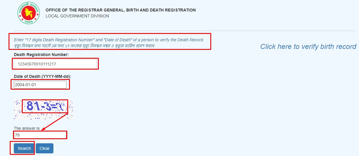 তাই মৃত্যু নিবন্ধন সনদের তথ্য যাচাই করার জন্য প্রথমে নিবন্ধনের নম্বর এবং জন্ম তারিখ এবং মৃত্যু তারিখ উল্লেখ করতে হবে।