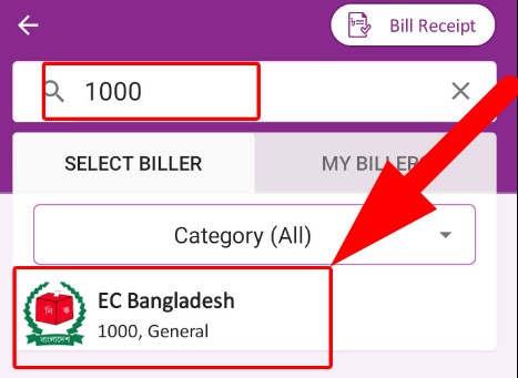 বিলার আইডি লেখার সাথে সাথে নিচে EC (ইলেকশন কমিশন) বাংলাদেশ লেখা চলে আসবে সেটার উপর ক্লিক করলে নিচের ছবির মত চলে আসবে।