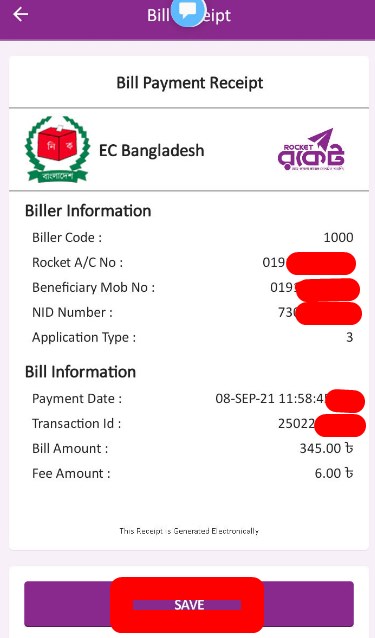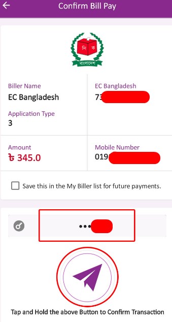আপনারা উপরে যে ছবিটি দেখতে পারছেন সেখানে, বিলার নেম দেখাবে, এনআইডি কার্ড নম্বর দেখাবে, অ্যাপ্লিকেশন টাইপ দেখাবে, টাকার পরিমাণ এবং যে নাম্বার থেকে বিল পরিশোধ করছেন সেই মোবাইল নম্বরটি দেখানো হবে।