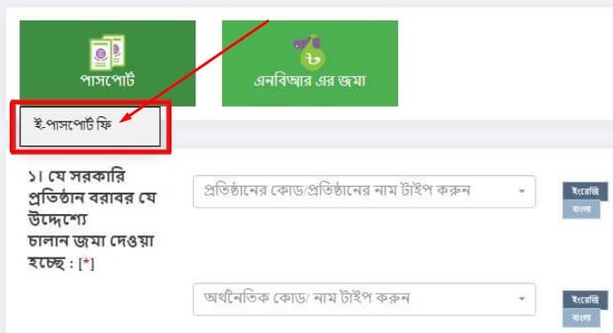 অনলাইনে এই পাসপোর্ট এর টাকা জমা দেয়ার জন্য এ চালান ওয়েবসাইটে প্রবেশ করে ই পাসওয়ার্ড ফি নির্বাচন করুন। তারপর পাসপোর্ট এর পৃষ্ঠা সংখ্যা, মেয়াদ এবং ডেলিভারির ধরন নির্বাচন করুন।