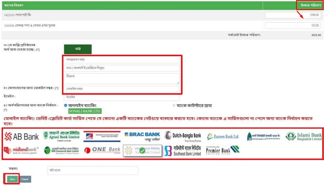 তারপর যে ব্যক্তির পাসপোর্ট এর জন্য ফ্রি পরিশোধ করা হয়েছে। তার জাতীয় পরিচয় পত্র/ জন্ম নিবন্ধন নম্বর সনাক্ত করার নম্বর, নাম, ঠিকানা এবং মোবাইল নাম্বার যুক্ত করতে হবে।