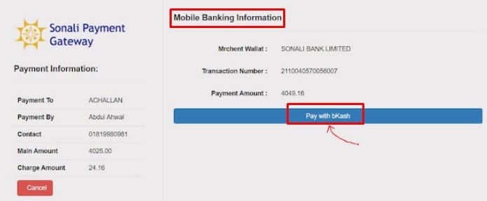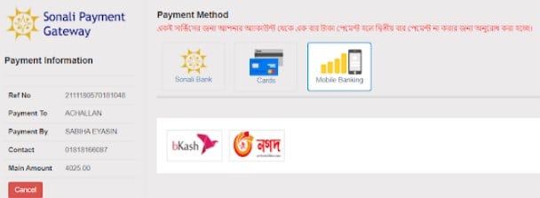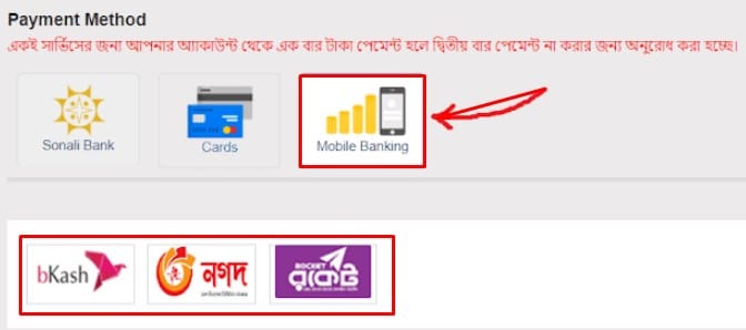 তারপর সেট বাটনে ক্লিক করে দেবেন আপনাকে সোনালী ব্যাংকের পেমেন্ট নিয়ে যাওয়া হবে। এখানে মোবাইল ব্যাংকিং বাটনে ক্লিক করে পেমেন্ট করতে পারবেন।