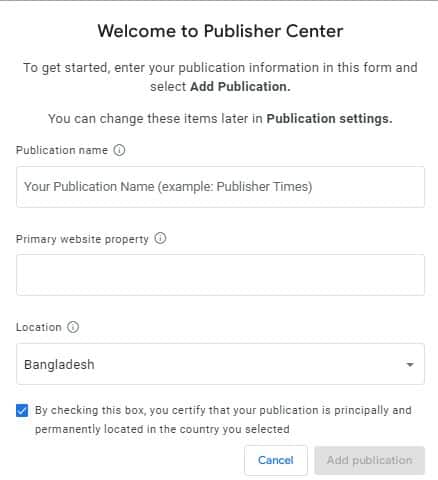 পদক্ষেপ– 2 : Welcome to Publisher Center বক্সে আপনার প্রয়োজনীয় কিছু তথ্য চাওয়া হবে। যেমন-