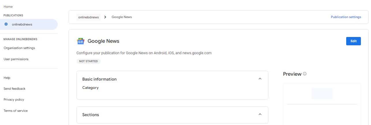 এখন আপনি উপরে যে পেজটি দেখতে পারছেন এটি হলো গুগল নিউজ এর ড্যাশবোর্ড। এখন আপনাকে এখান থেকে আপনার ওয়েবসাইট টি গুগল নিউজ এর জন্য আবেদন করতে হবে। তার জন্য আপনাকে Google News + Edit অপশনে ক্লি করতে হবে। তারপরে আপনাকে আরো একটি পেজ দেওয়া হবে নিচের ছবিটি দেখুন।
