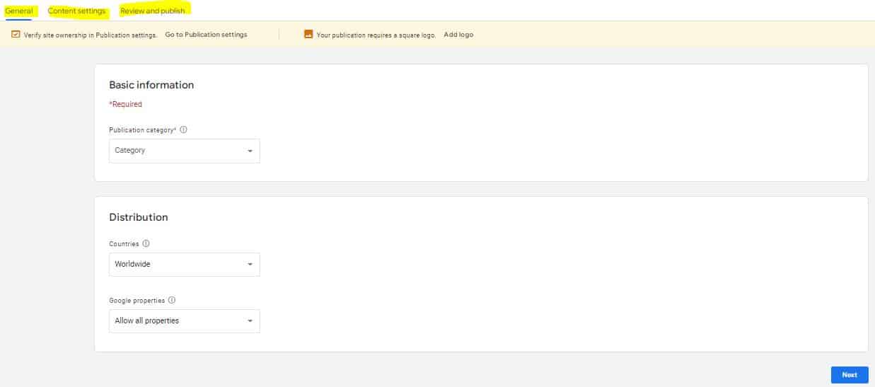 পদক্ষেপ– 5 : এখন আপনি Basic information নামে একটি স্টেপ পেয়ে যাবেন। সেখানে আপনার Publication name – (সাইটের নাম দিবেন), Primary language- (English সিলেক্ট করবেন), Location- (দেশের নাম দিবেন যেমন- বাংলাদেশ), Primary website property URL (আপনার সাইট গুগল সার্চ কনসলে যুক্ত করে ভেরিফাই অপশনে ক্লিক করতে হবে)।