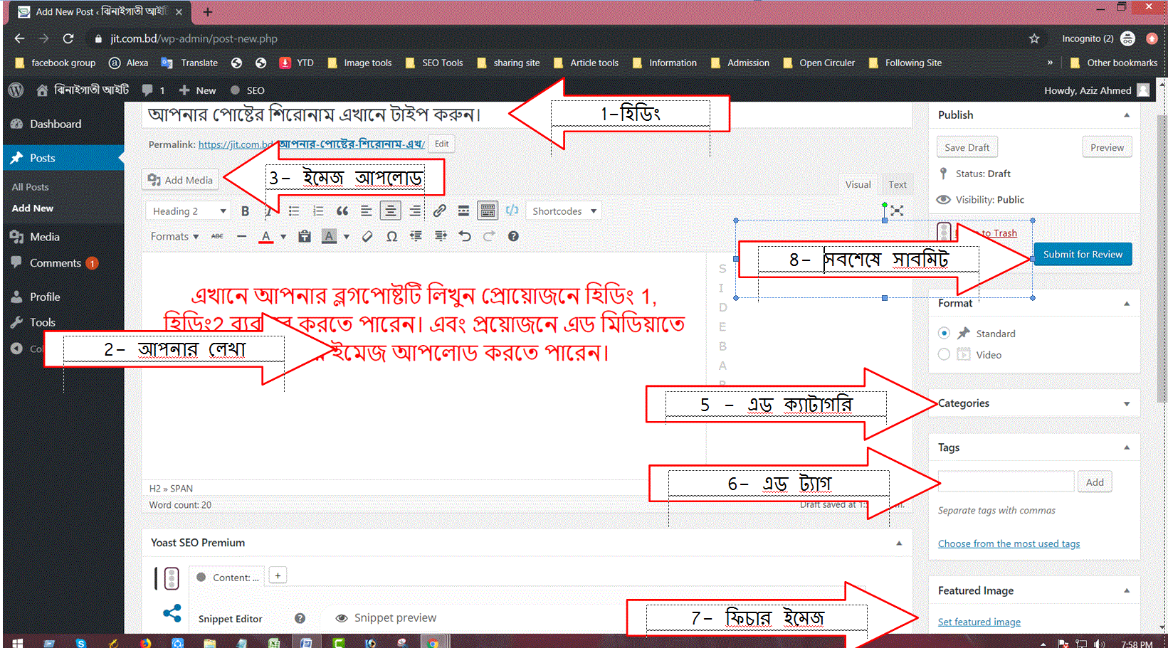 অতঃপর এ্যাডপোস্ট বাটনে ক্লিক করে আপনি একটি নতুন পোস্ট লিখতে পারবেন। যেখানে প্রথমে আপনাকে একটি রিডিং দিতে হবে। তারপর আপনার লেখাটি সম্পূর্ণ ভাবে টাইপ করে পাবলিশ করার পূর্বে অবশ্যই ড্যাশবোর্ড এর ডান দিক থেকে ক্যাটাগরি এবং সিলেক্ট করবেন। এবং ডান দিকে থাকা সেট ফিচার্ড ইমেজ অপশনে ক্লিক করে আপনার ফিচারস/থাম্বনেইল ইমেজটি আপলোড করুন। তারপর ভালো ভাবে চেক করে আপনার পোস্টটি সাবমিট ফর রিভিউ এ ক্লিক করুন।